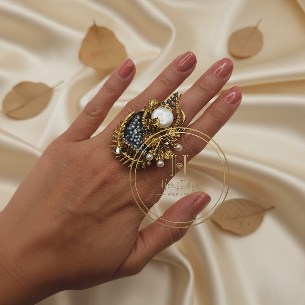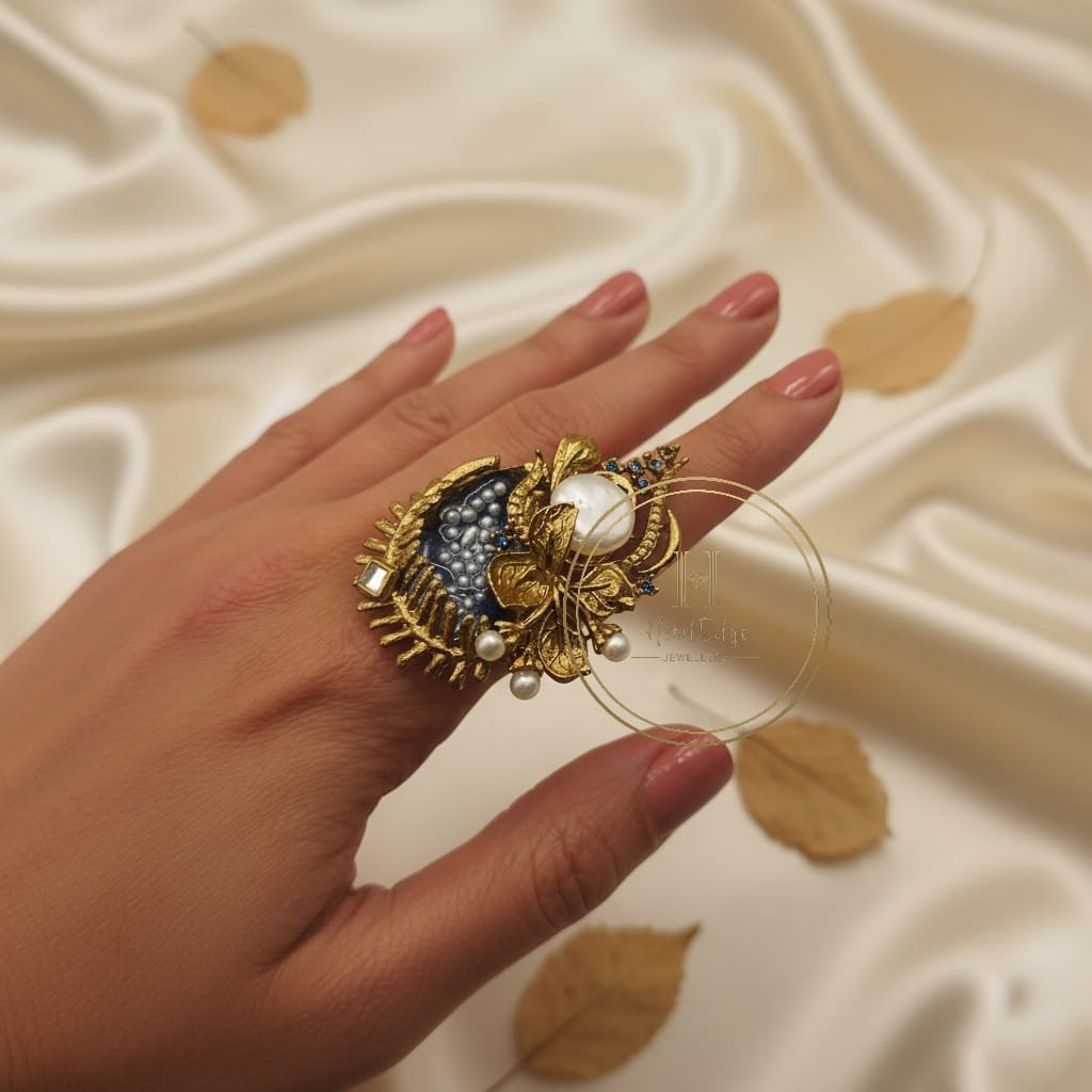 Complete your look with the Blue Ember ring from our Autumn Muse Collection, designed to mirror the quiet glow and richness of the season. This striking ring features deep blue enamel framed in radiant gold tones, accented with soft pearlescent highlights that echo the warmth of glowing embers under an autumn sky.
