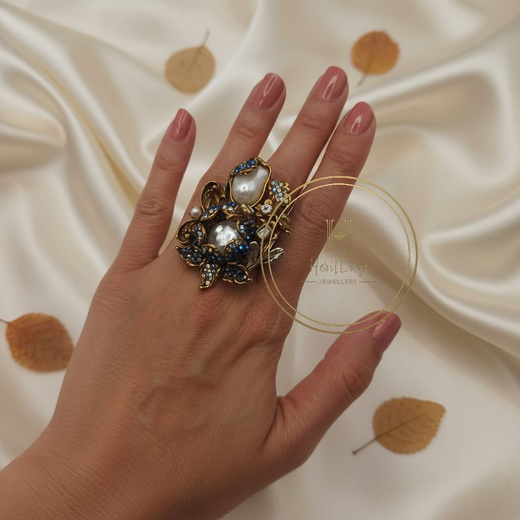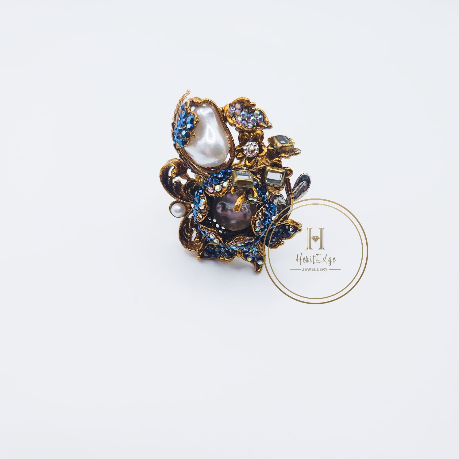 Make a striking impression with Bronze Blaze, a bold statement ring from our Autumn Muse Collection. Crafted in warm bronze metal, it features a large central pearl and delicate blue stones, combining elegance with daring design.