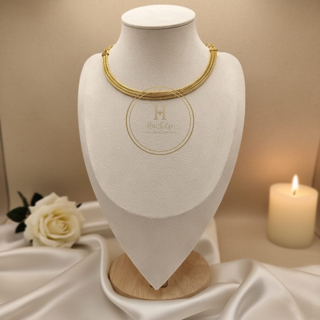 The name “Dhara” signifies a constant flow reflected in the way the light dances across the continuous textured lines of the metal. Despite its rigid, architectural form, it sits with surprising lightness, offering a bold silhouette that commands attention whether paired with a crisp white blazer or a traditional silk saree.