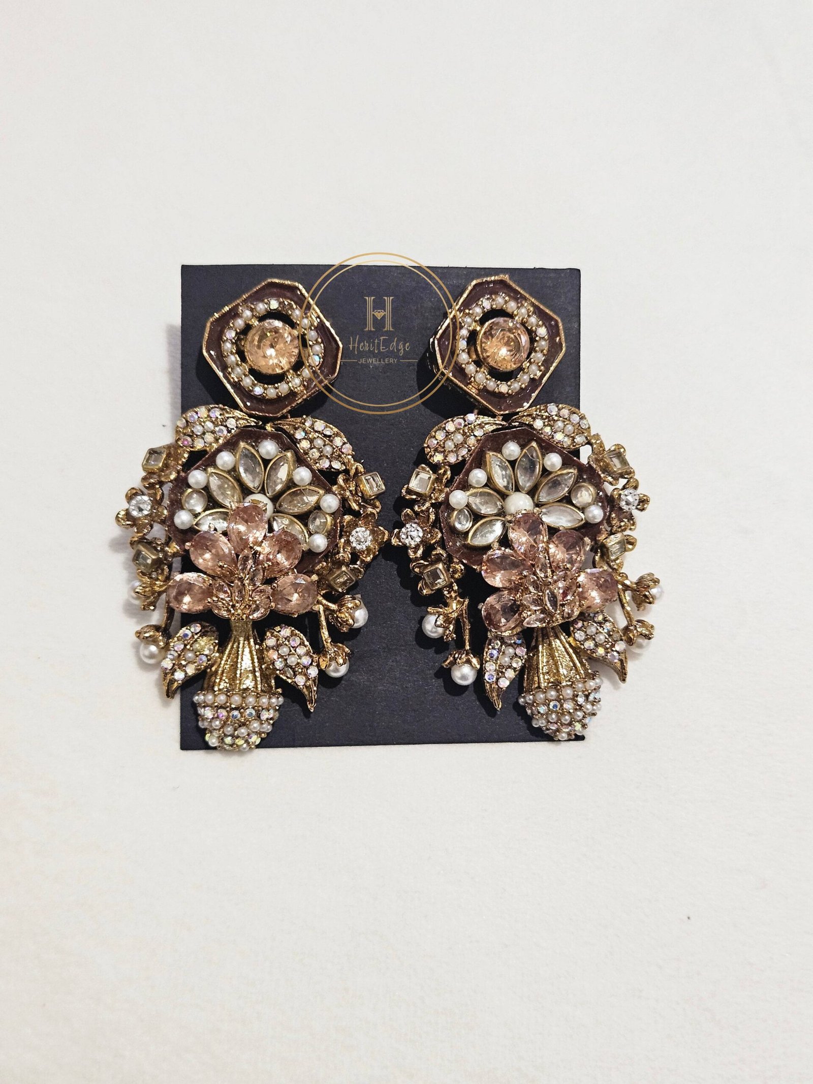 Discover the elegance of the Fallen Petals Earrings — stunning statement jewellery featuring blush tones, pearls, and intricate gold detailing. Perfect for weddings, parties, and festive occasions.