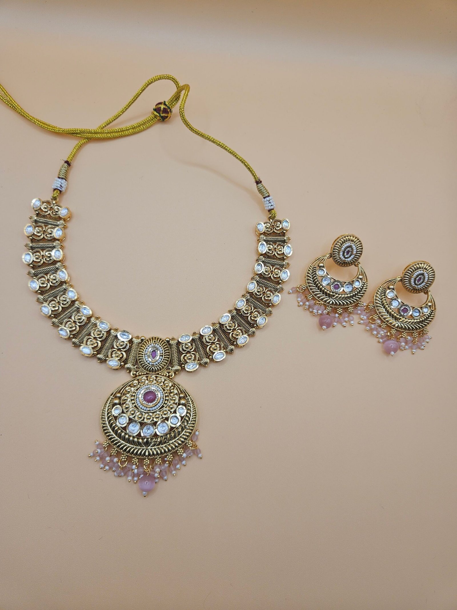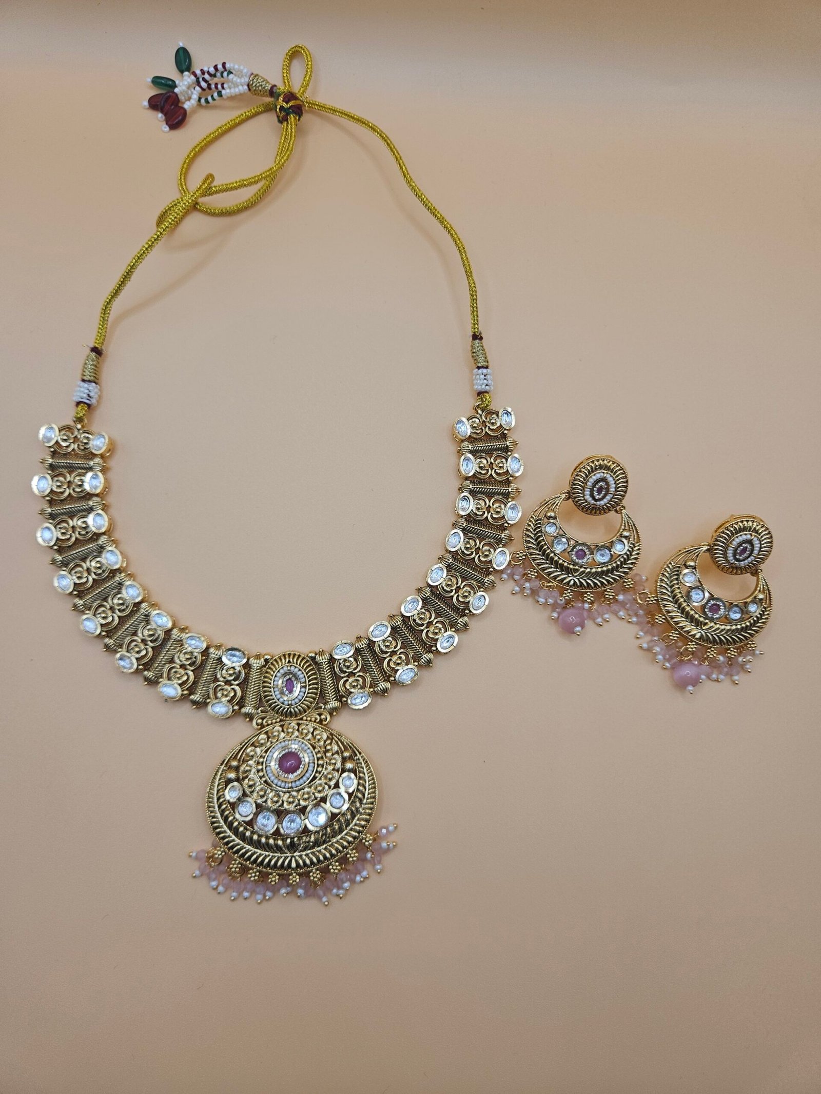 The necklace features a sculptural collar design made of intricate gold toned panels, each meticulously set with shimmering Kundan stones. The central medallion is a magnificent circular pendant, reminiscent of a blooming desert rose, accented with a focal ruby pink stone. The lower fringe is adorned with delicate blush pink clusters and smooth teardrop beads that add a soft, rhythmic movement.
