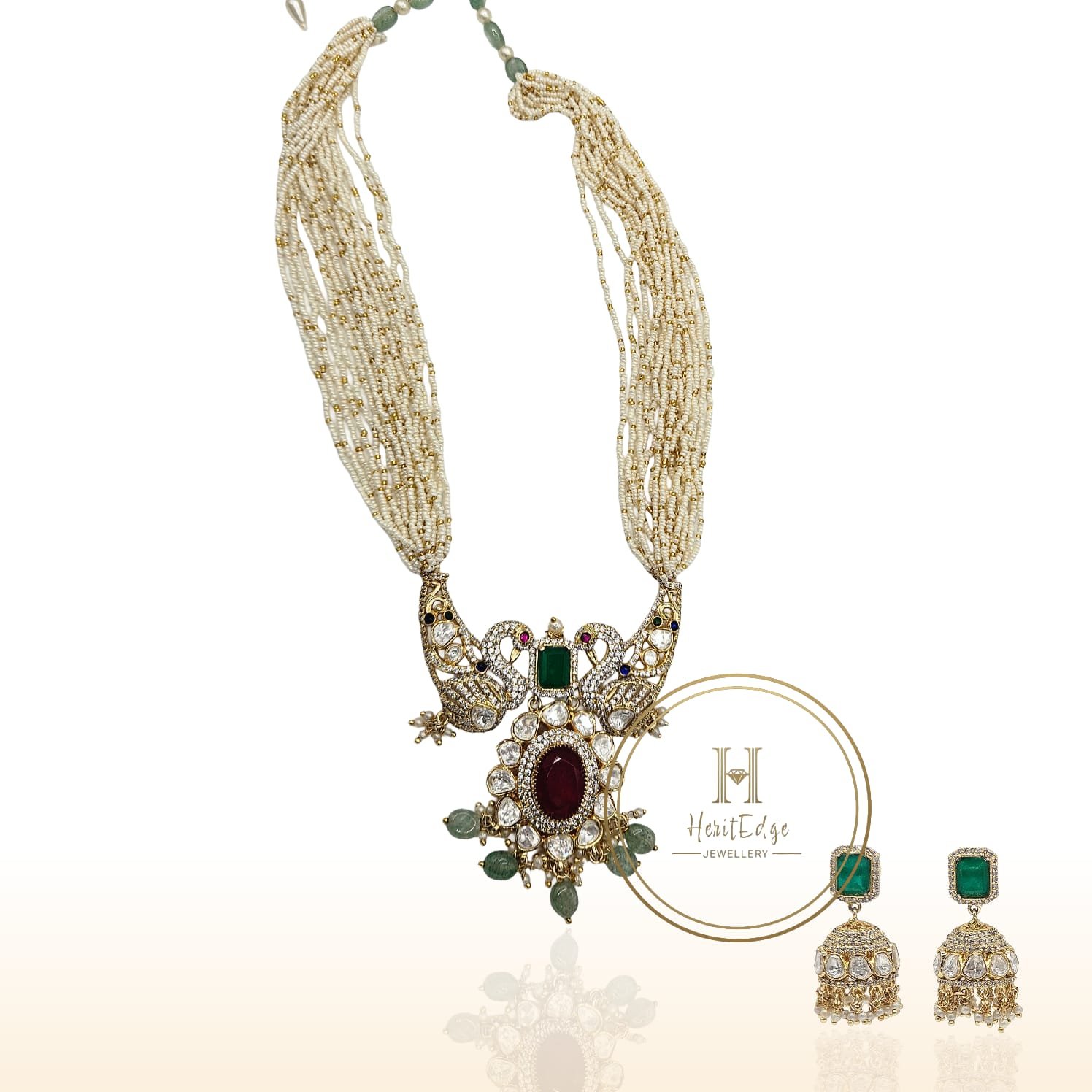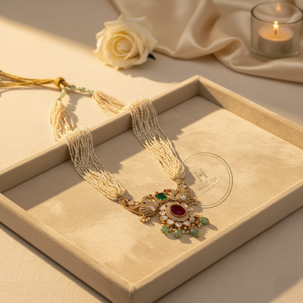 Elevate your elegance with this exquisite Mor Pearl Mala Set, featuring a stunning pendant adorned with two intricately designed peacocks. The pendant is beautifully embellished with a central red stone, complemented by delicate red and green accents that bring a regal charm. Soft light green pearl drops cascade gracefully, adding a subtle touch of sophistication and movement to the design.