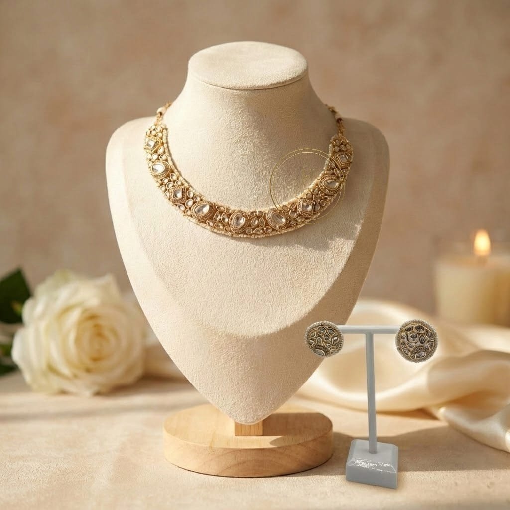 Featuring meticulously strung layers of premium ivory pearls and a centerpiece of radiant Kundan stonework, Amora is a celebration of light. The warm, gold toned imitation finish provides a royal luster that transitions seamlessly from a sun drenched brunch to a starlit wedding reception.
