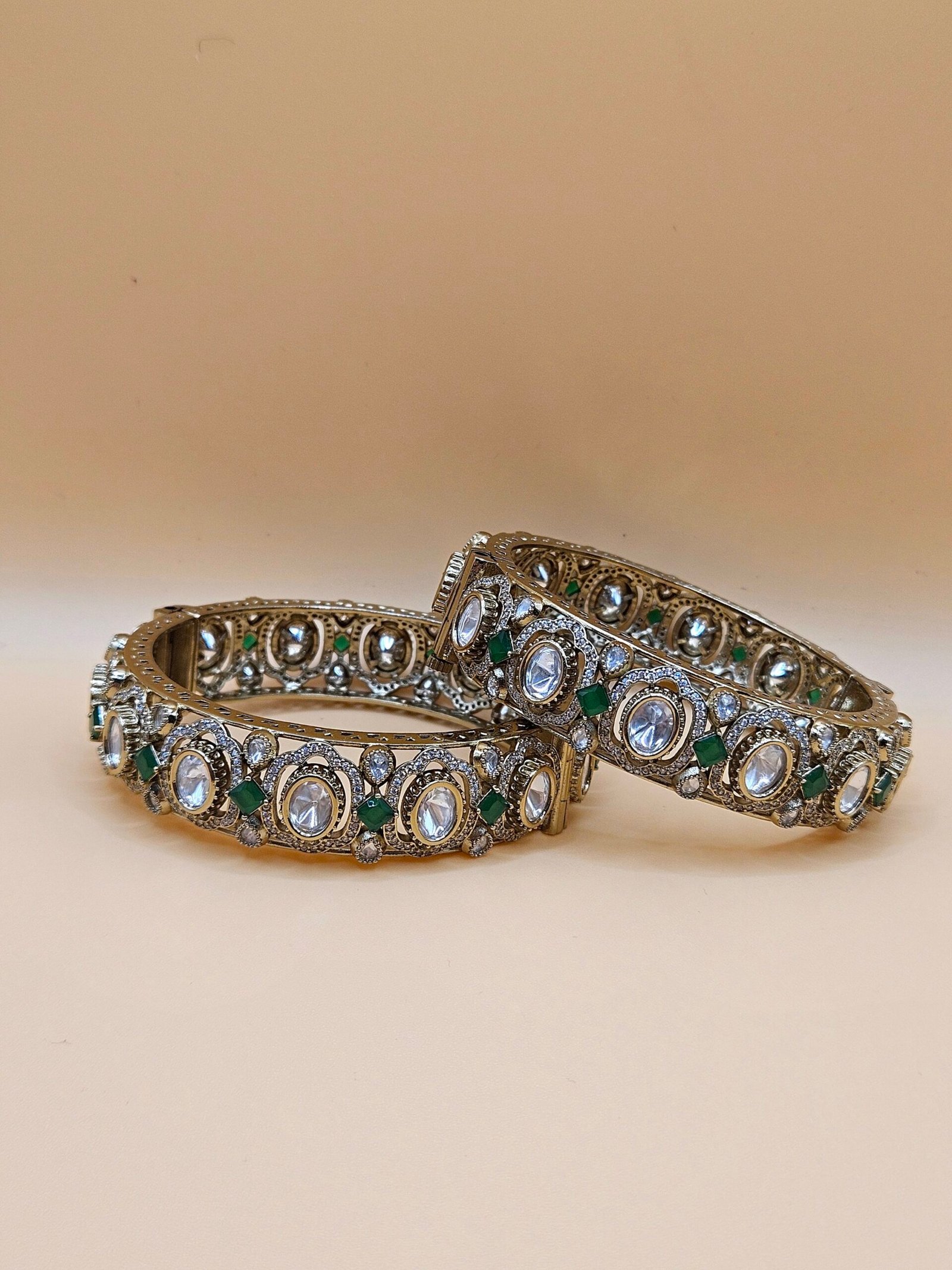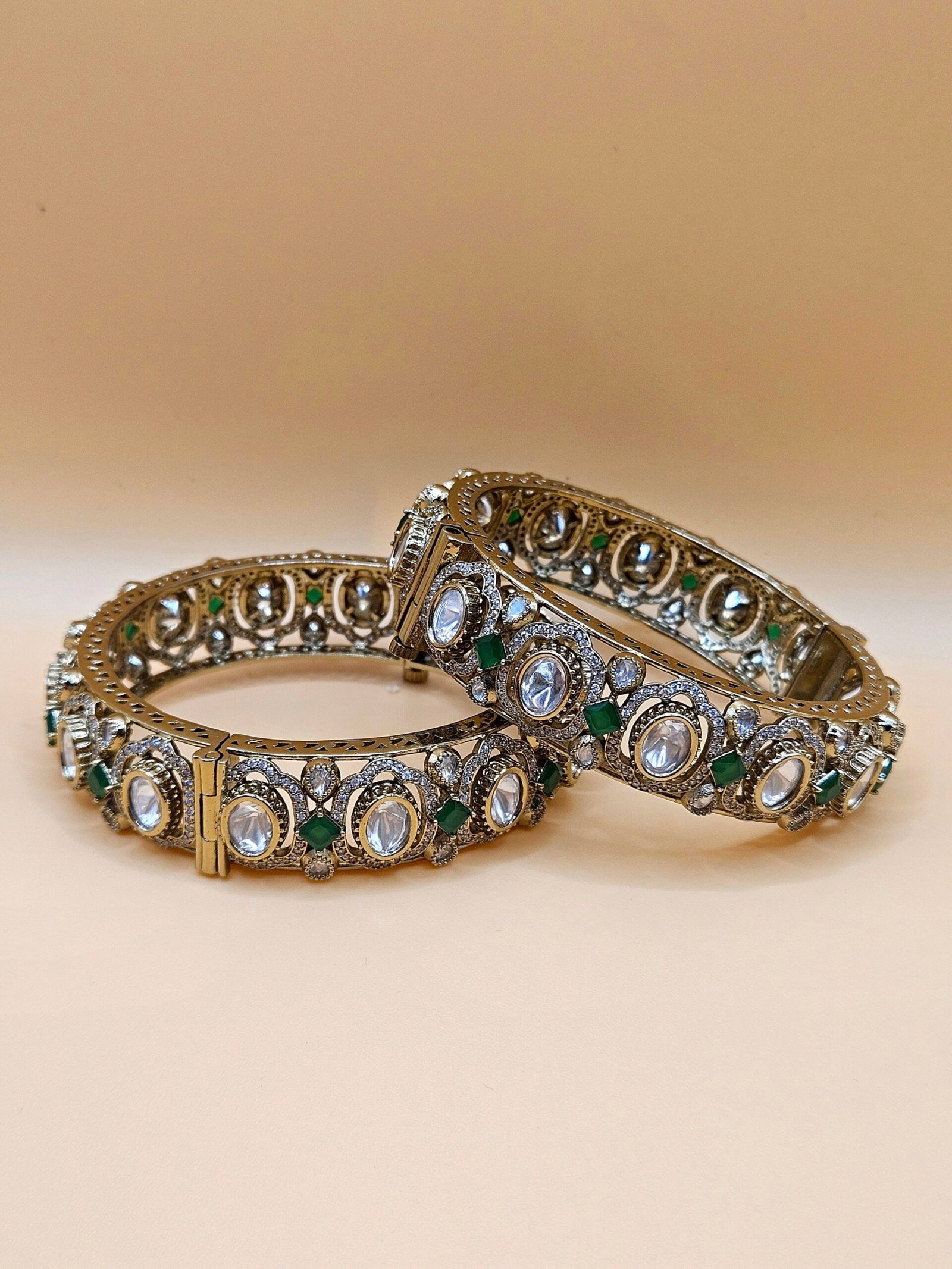 Adorn your wrists with the regal Raha bangles from the Bahaar Collection. Featuring intricate antique gold imitation filigree, vibrant emerald accents, and shimmering Polki style stones. The perfect statement is jewellery for weddings and festive elegance. Shop Heritedge!