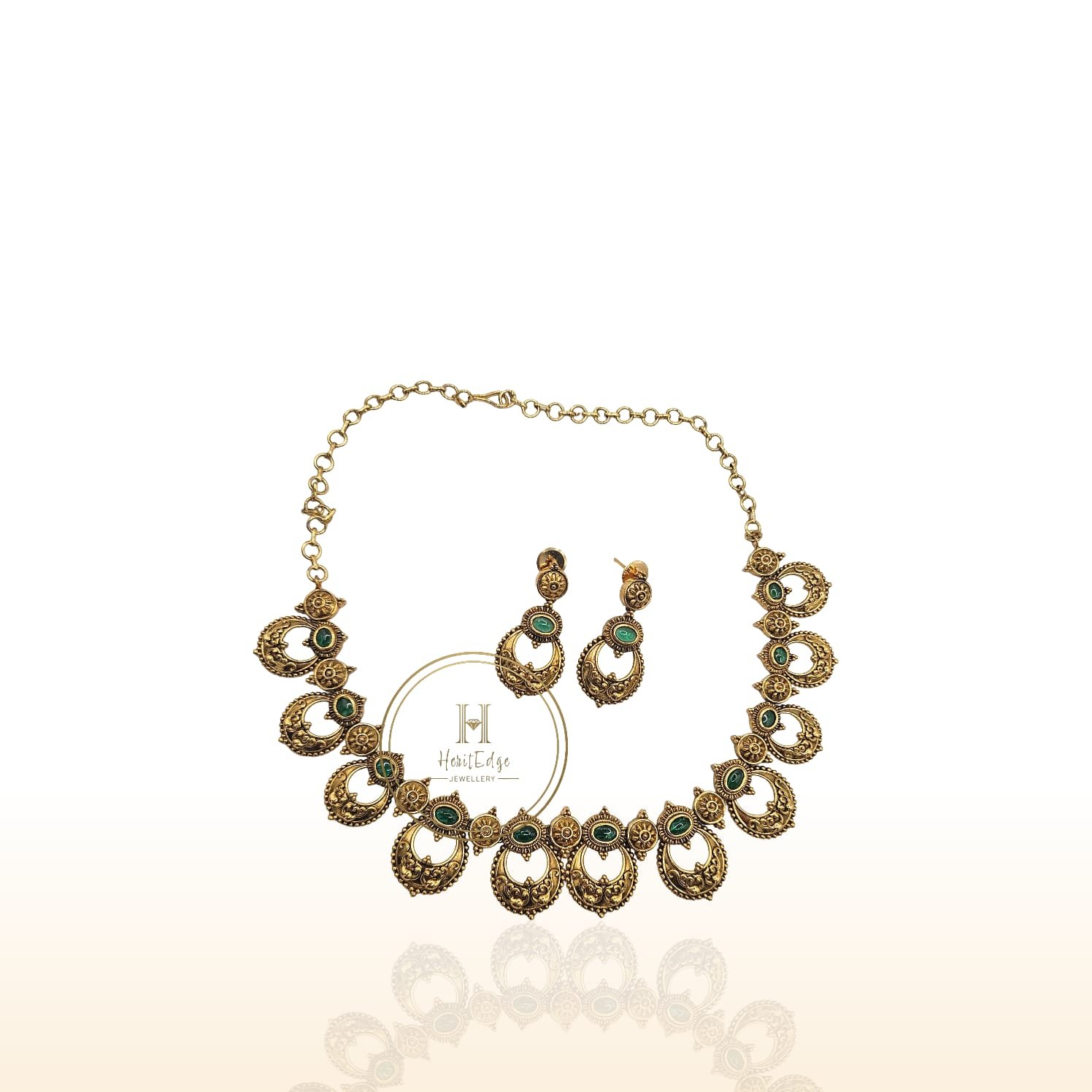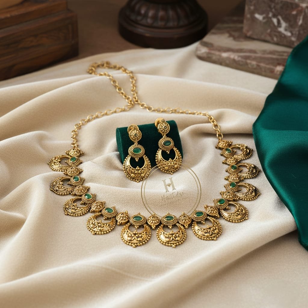 Elevate your traditional look with this exquisite Antique Gold Riwaaze Necklace Set, designed to capture the timeless elegance of heritage jewellery. Crafted with precision, the necklace features intricately carved chandbali motifs finished in a rich antique gold polish, giving it a luxurious vintage charm. Stunning emerald-green stones add a regal pop of colour, creating a captivating blend of tradition and sophistication.