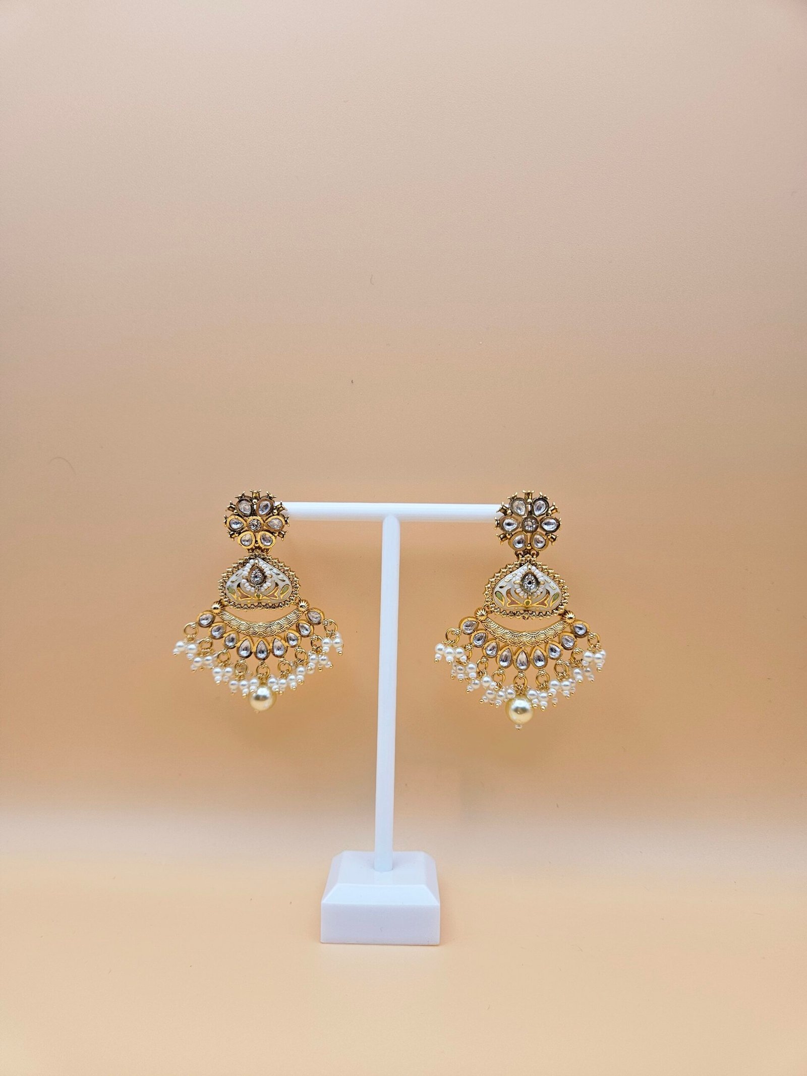 Shop the Riya Earrings from Heritedge’s Bahaar Collection. Exquisite imitation gold jewellery featuring Kundan stones, pearl drops, and intricate floral artistry.