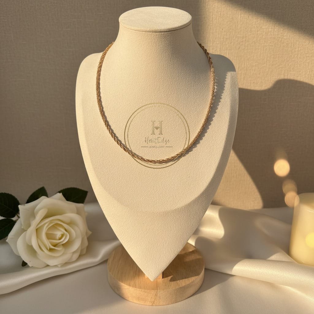 This distinctive chain features a tightly twisted rope design that is meticulously crafted to hold a beautiful, fixed silhouette when worn. Its “stiff chain” structure elegantly defines the neckline, offering a substantial presence while its slightly longer length ensures it hangs gracefully, making it ideal for both higher and lower necklines.