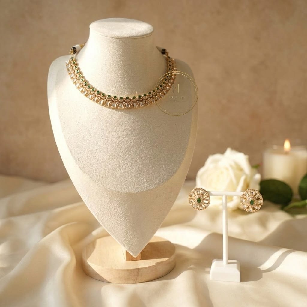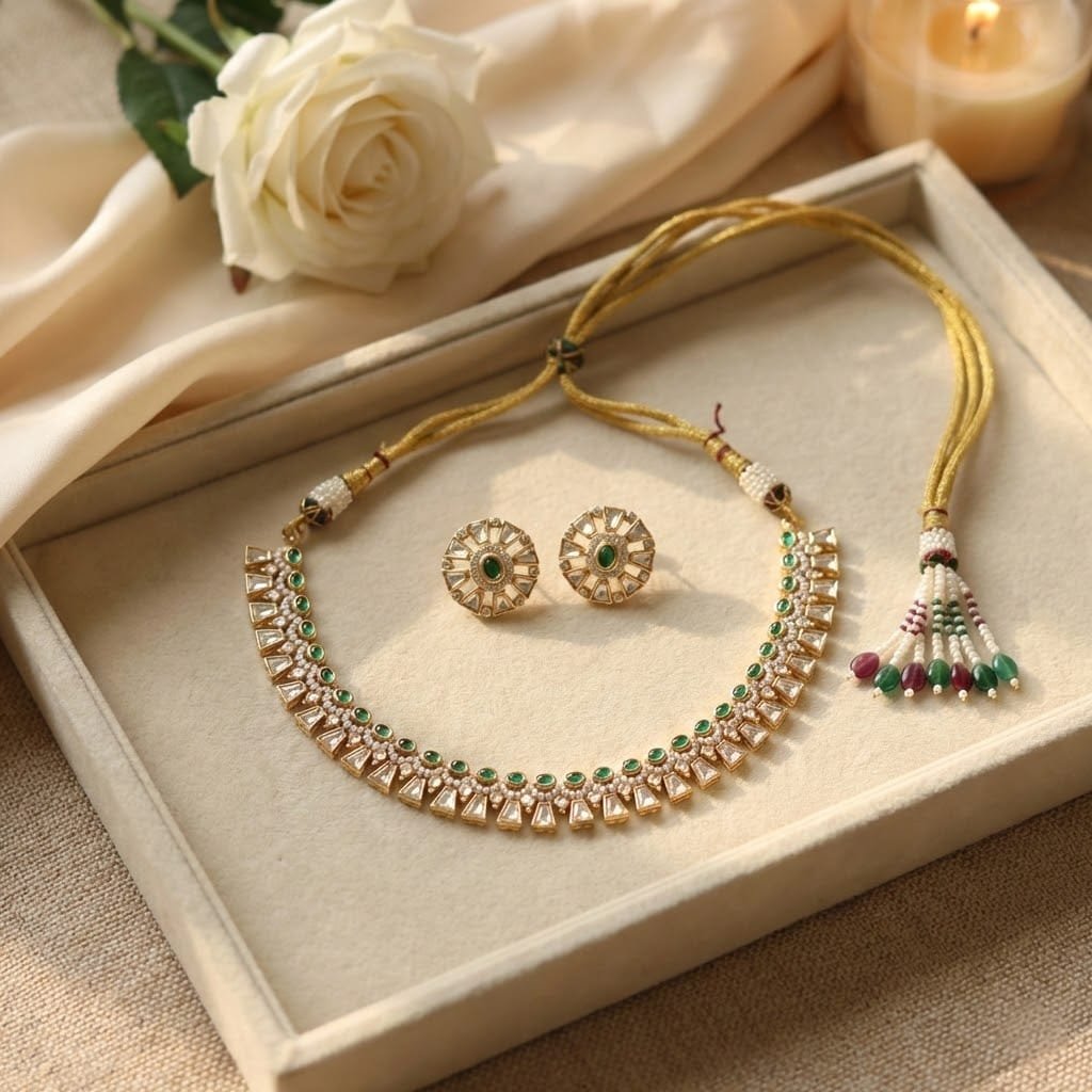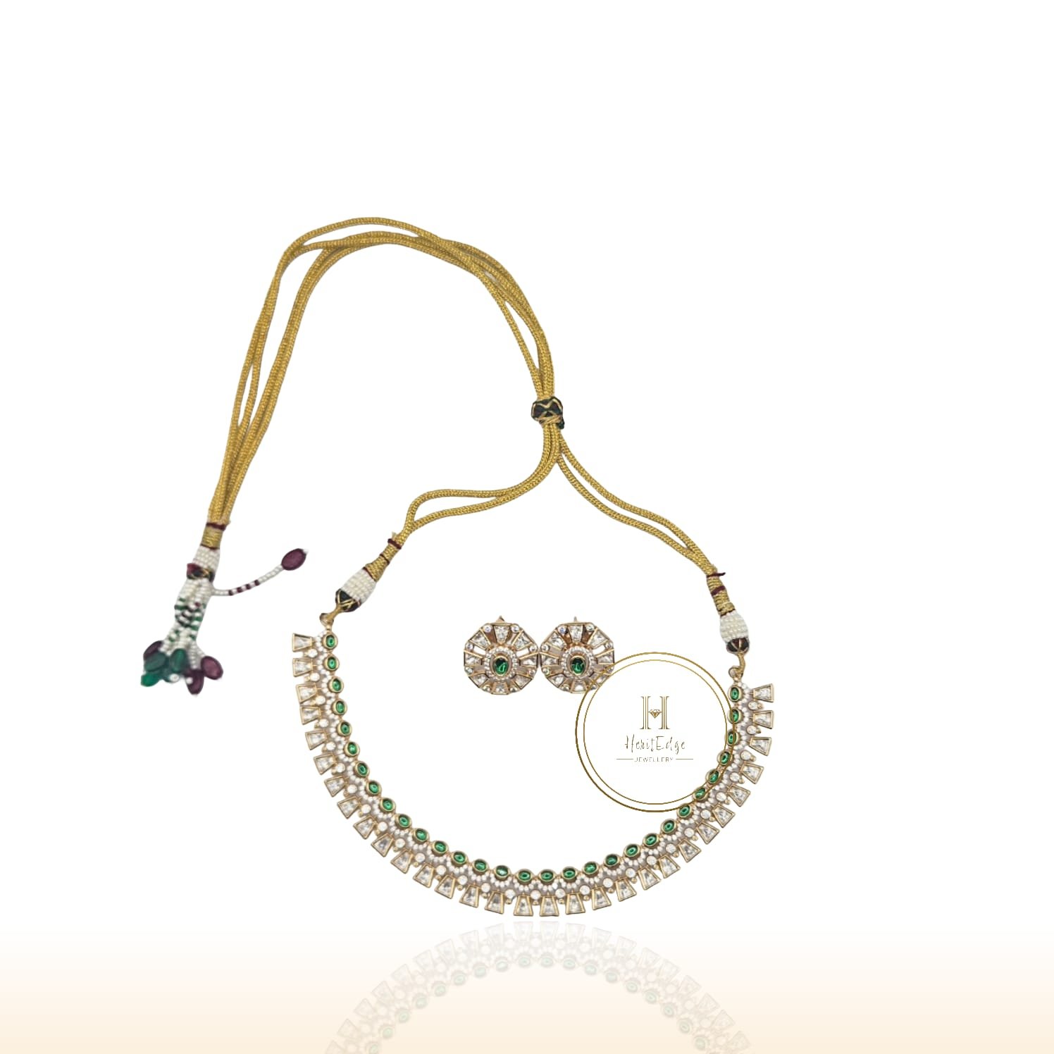 This set features a delicately structured necklace, where high-luster -]ion Polki stones are arranged in a rhythmic, radiating pattern. Each segment is punctuated by a brilliant emerald green accent stone, mimicking the sun filtering through dense forest leaves. The ensemble is completed with matching sunburst-style studs that offer a sophisticated, concentrated glow.