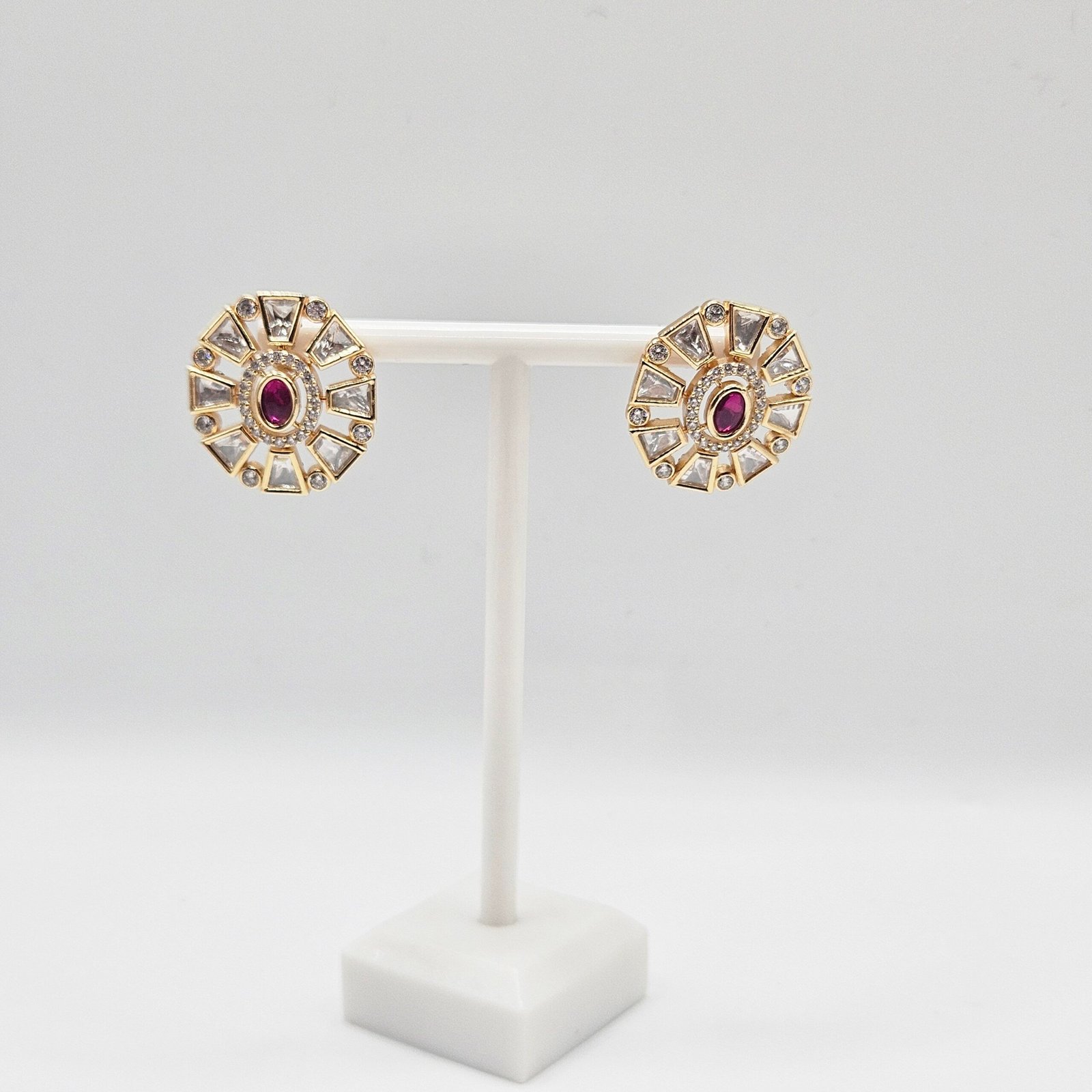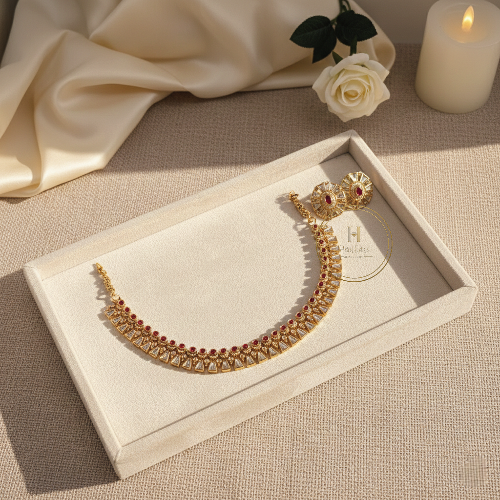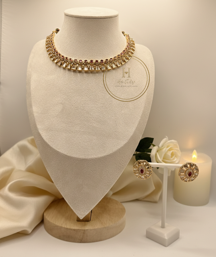 This set features a delicately structured necklace, where high-luster -]ion Polki stones are arranged in a rhythmic, radiating pattern. Each segment is punctuated by a brilliant emerald green accent stone, mimicking the sun filtering through dense forest leaves. The ensemble is completed with matching sunburst-style studs that offer a sophisticated, concentrated glow.