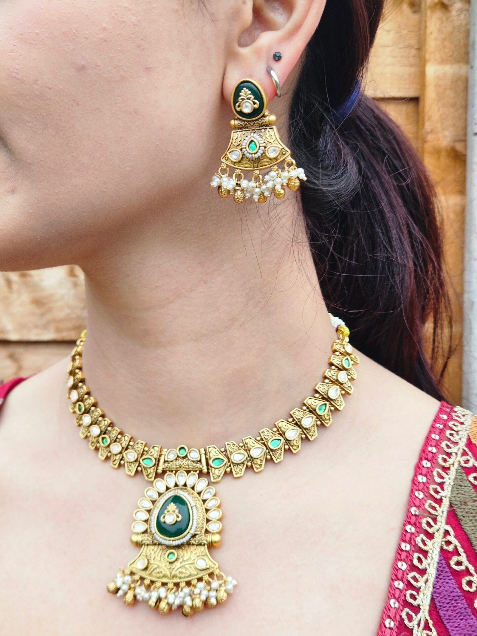 Step into the spotlight with the Zahra Antique Emerald & Pearl Choker Set, a crowning jewel from the Bahaar Collection by Heritedge. Designed to mimic the grandeur of royal heirlooms, this imitation gold set features a flexible, intricately textured collar necklace that rests perfectly on the collarbone.
