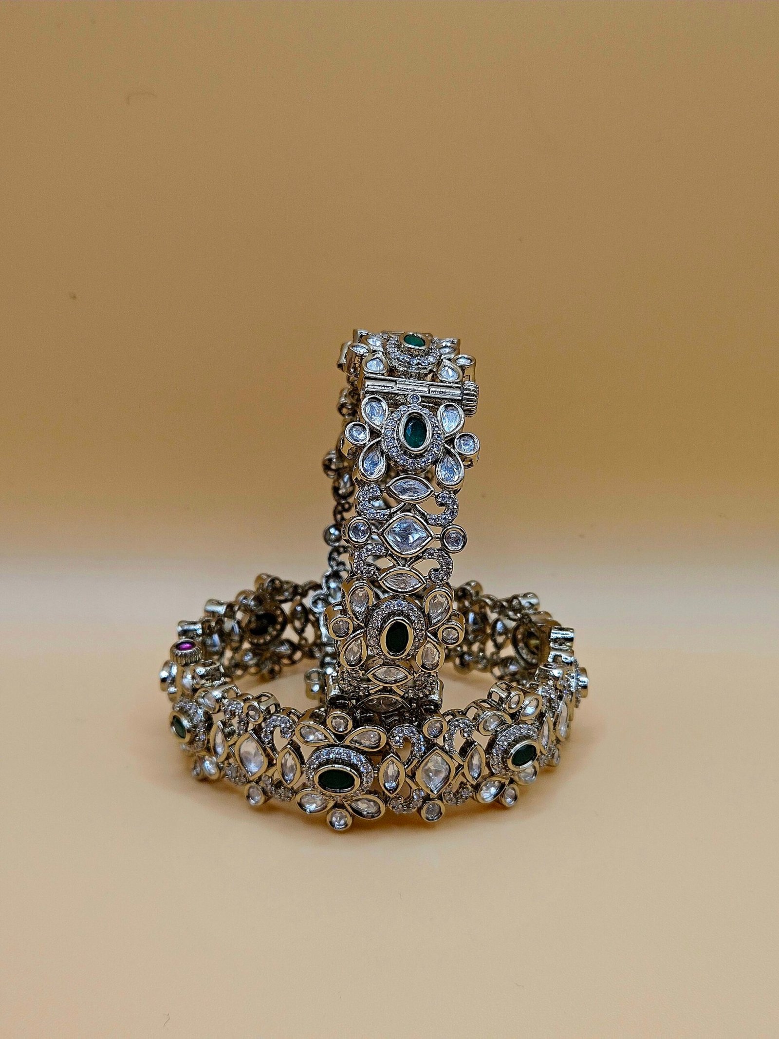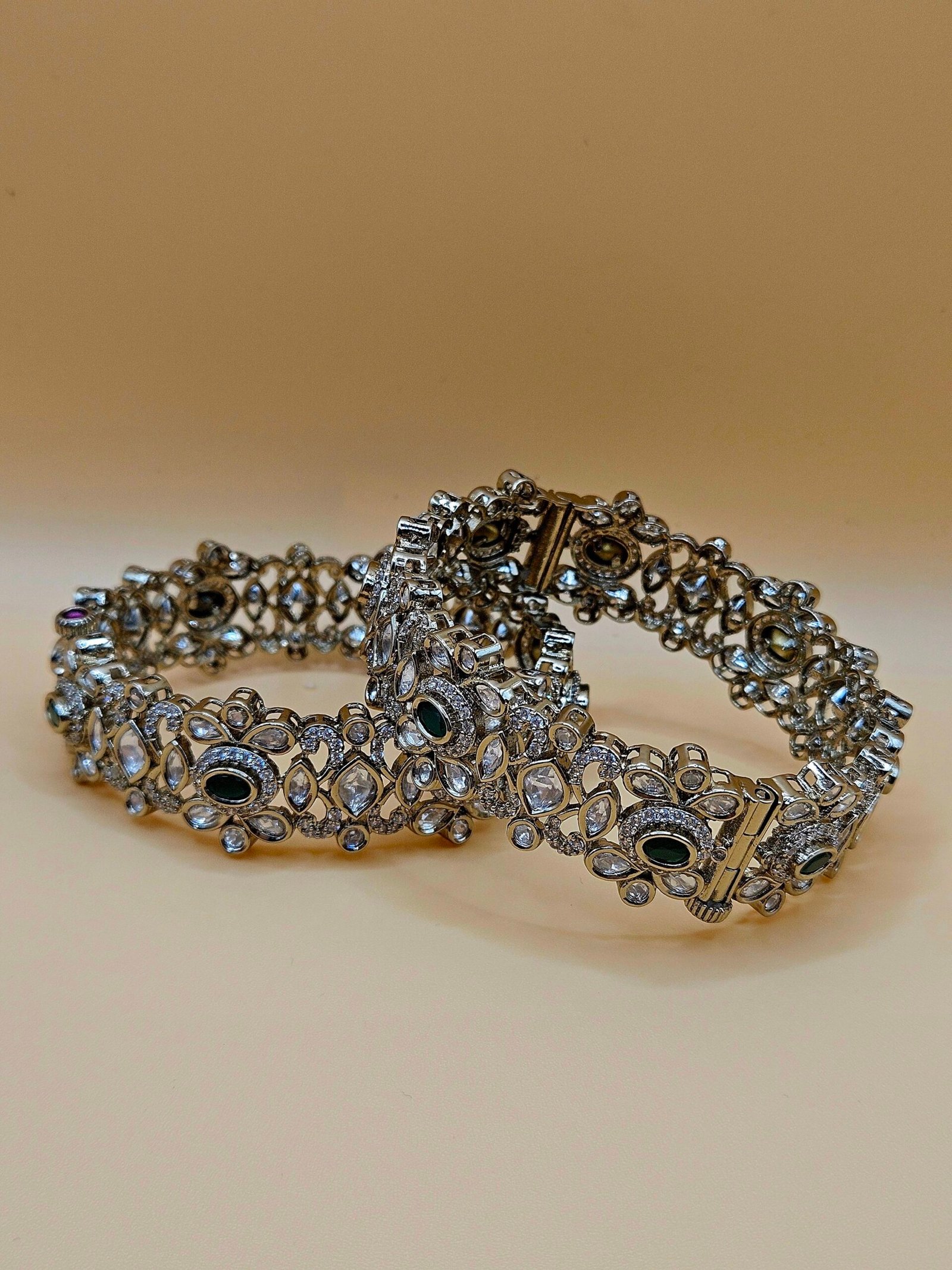 Where old world royalty meets the freshness of spring. The Zaira bangles feature intricate floral lacework , meticulously set with brilliant diamond imitate stones and finished with deep emerald accents. Designed for the modern woman who carries her heritage with an edge, these pieces bring a radiant, ‘blooming’ elegance to any ensemble.