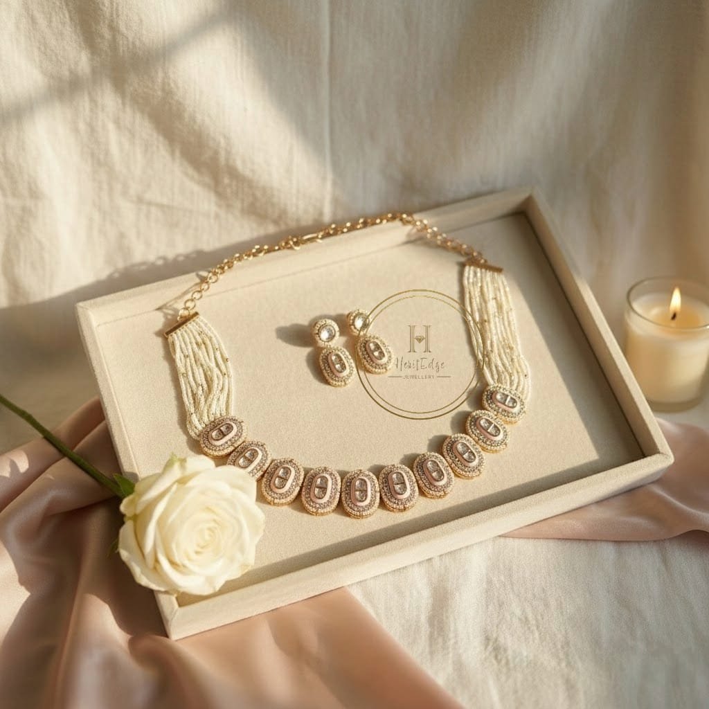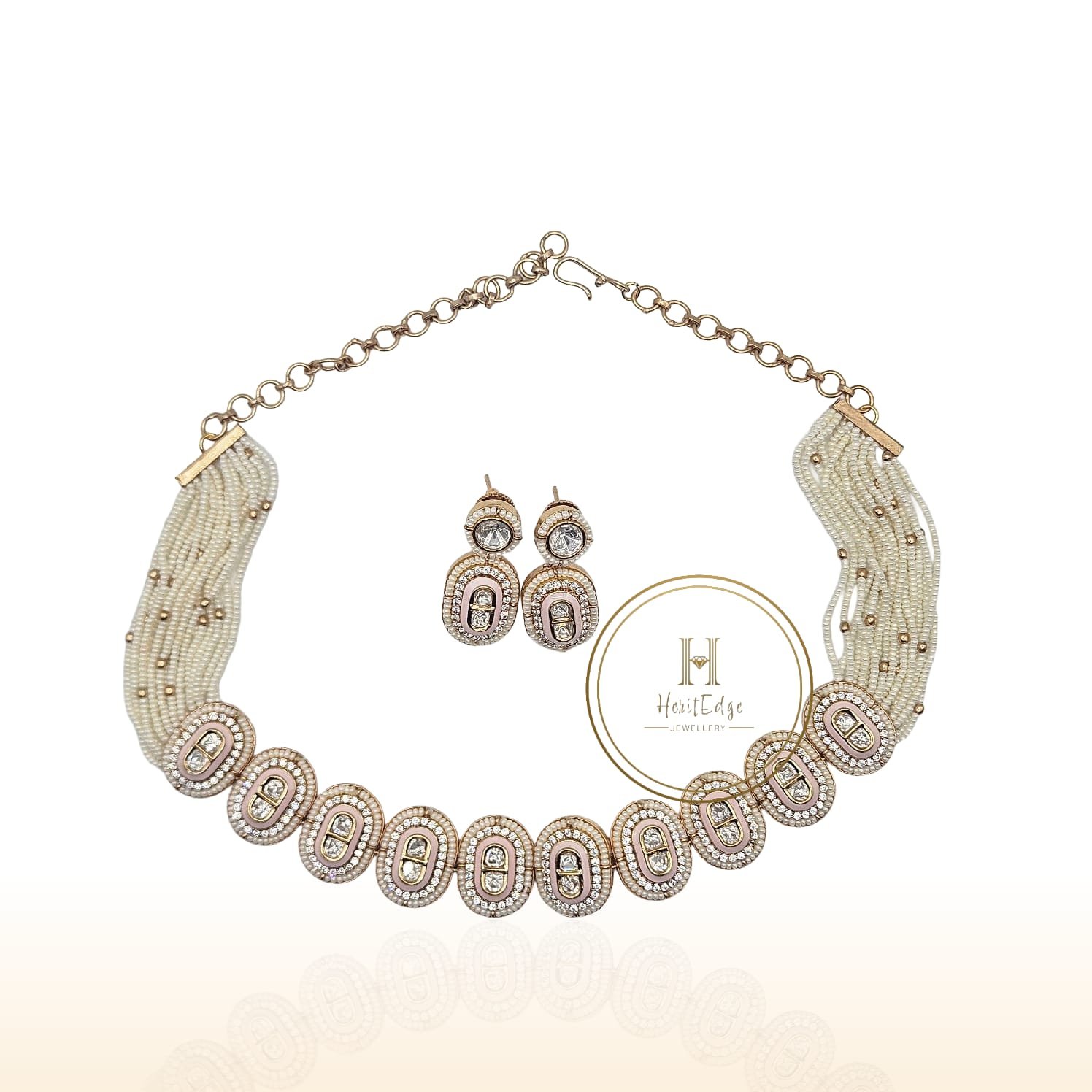 This set reimagines traditional jewelry with a contemporary twist. It features a series of beautifully crafted oval motifs, each inlaid with soft pink enamel and encircled by shimmering white stones. These motifs are seamlessly integrated into a luxurious, multi-layered pearl band, creating a “choker” style that frames the neck with effortless grace.